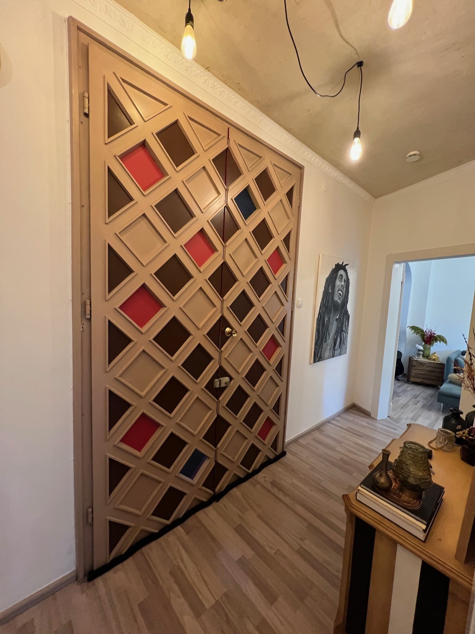 Wohnungseingangstüren sind in den 70er Jahren von einem Tischler aus Holz und Glas handgefertigt worden.