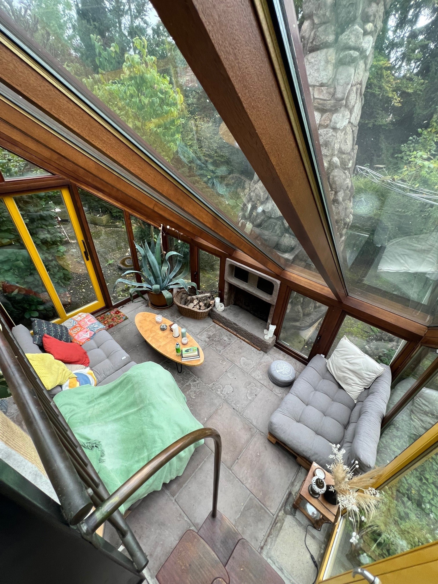 handgebauter Kamin, der von innen des Wintergartens als auch von außen von der Terrasse aus zu befeuern ist.