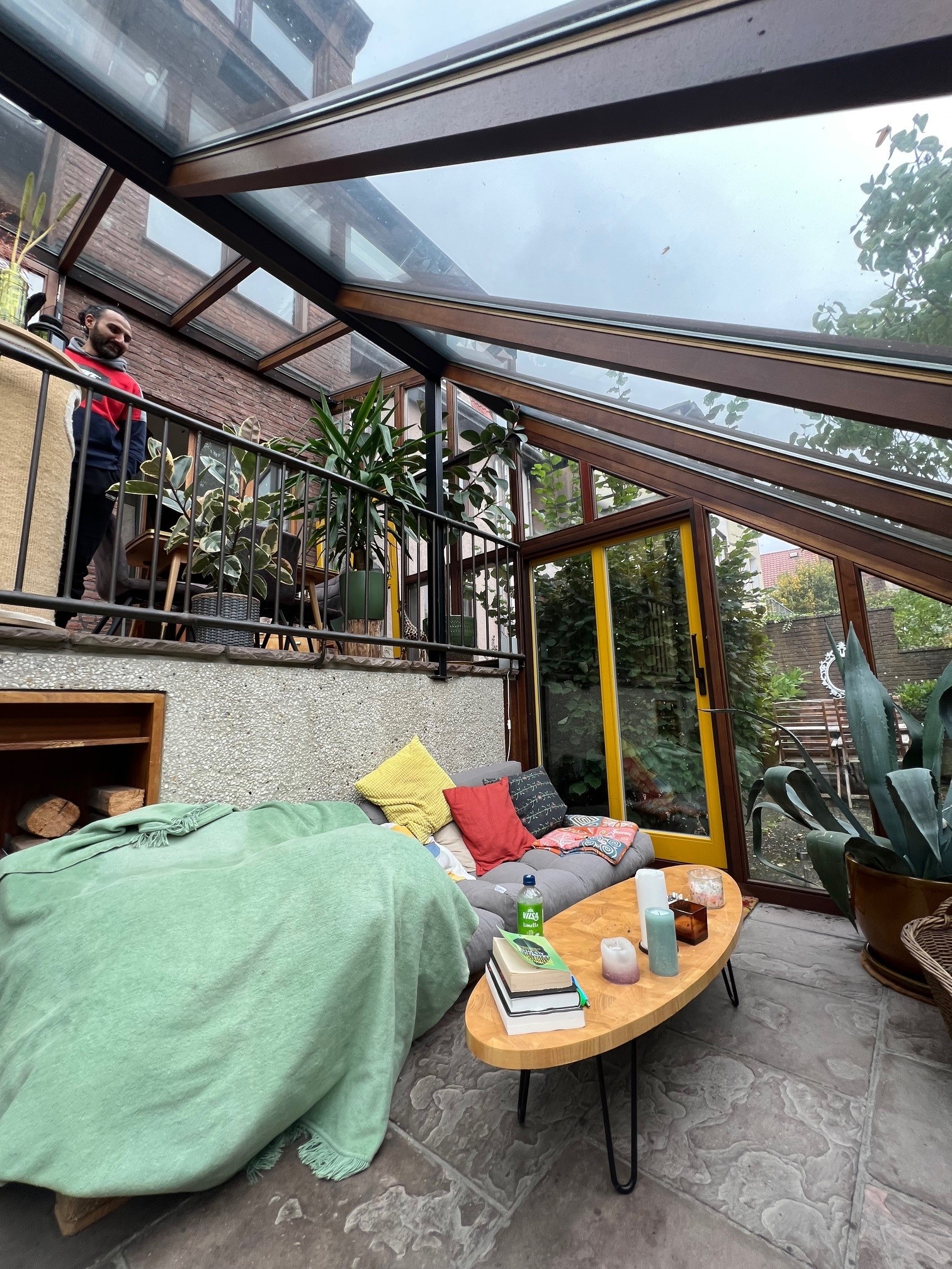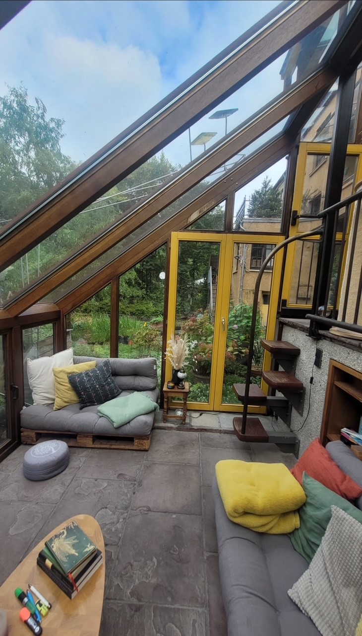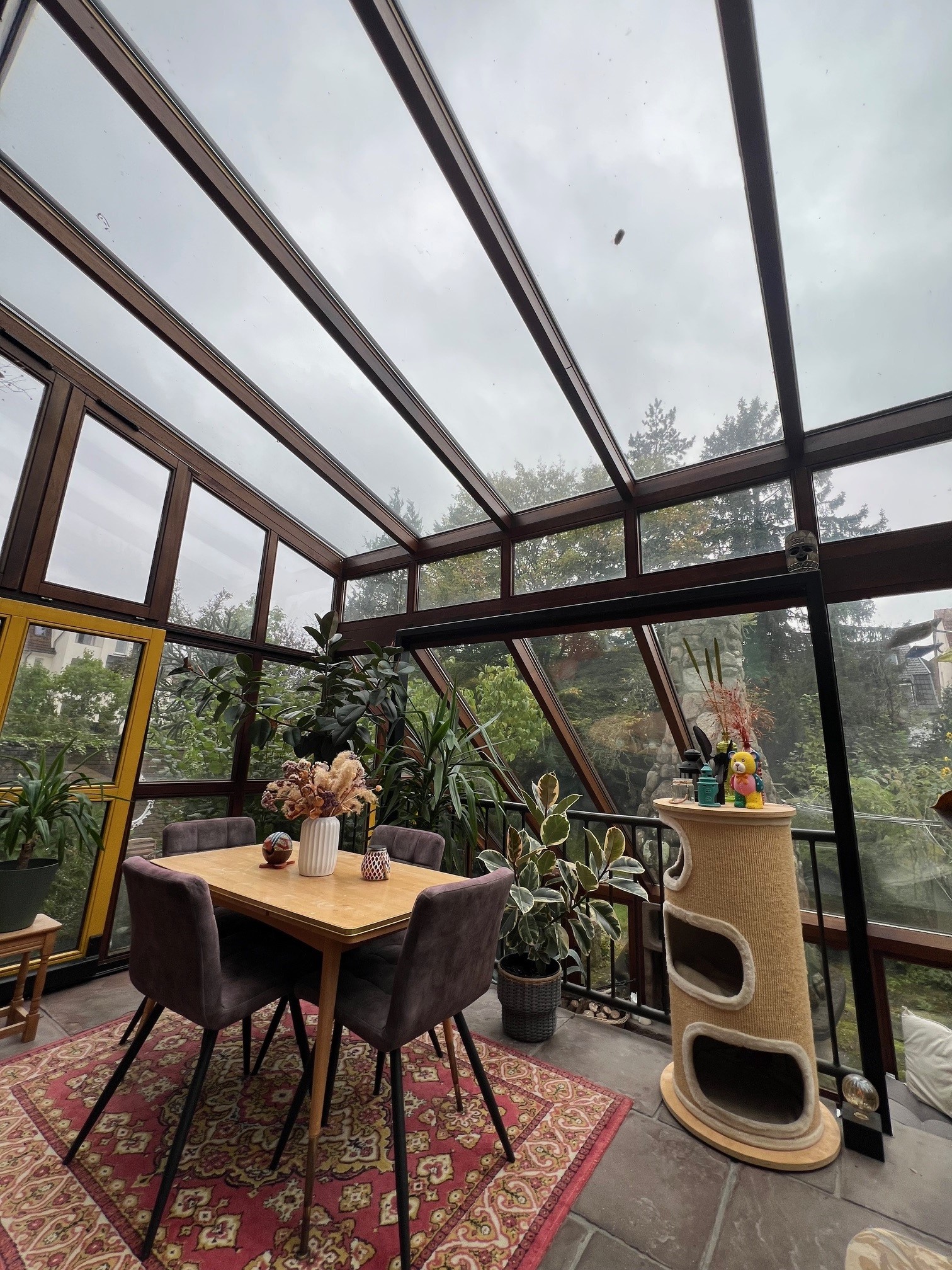 Fußboden ausgelegt wurde. Der obere Bereich des Wintergartens ist groß genug für einen großen Esstisch. Die
