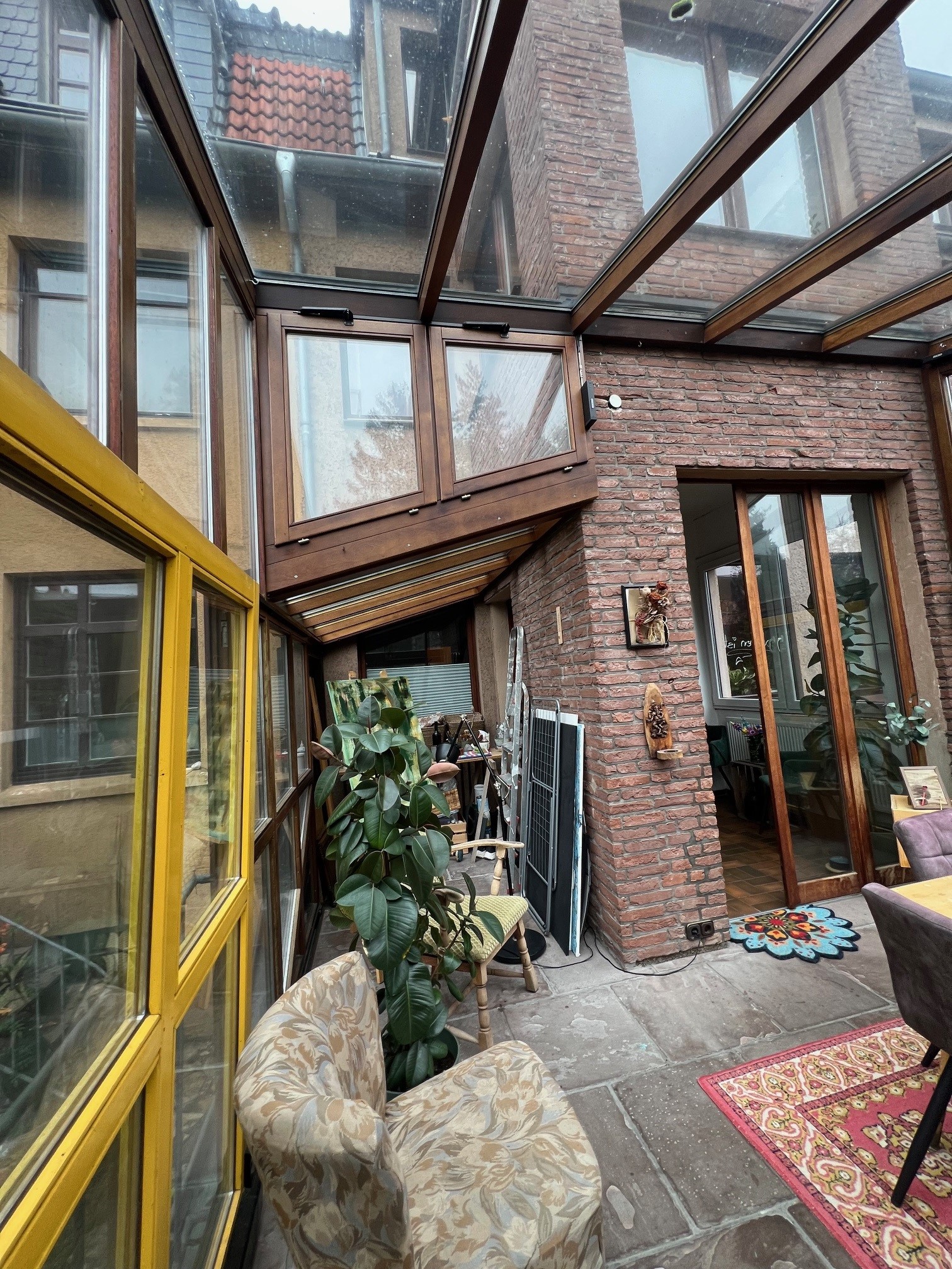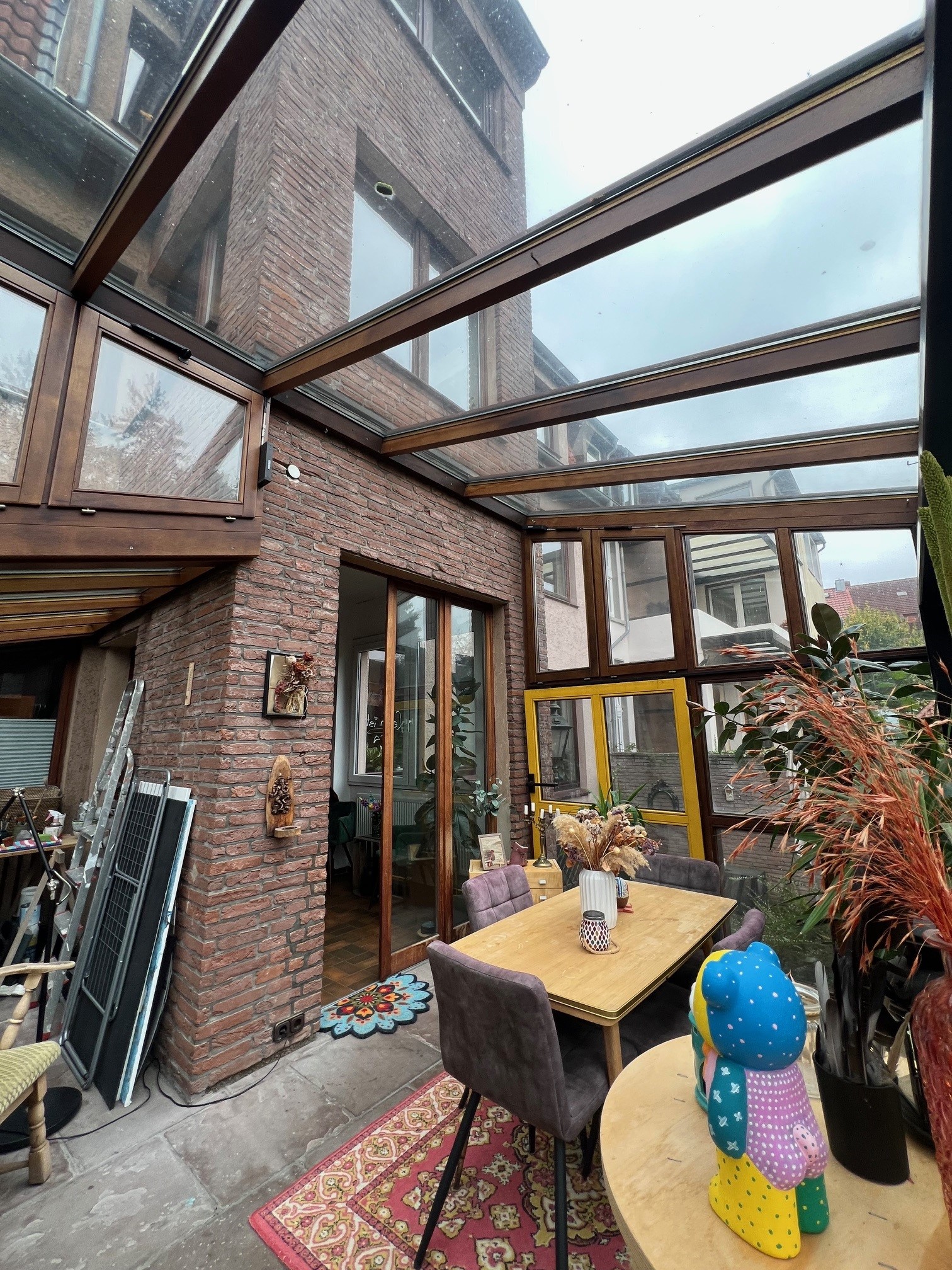 besteht aus robustem Hartholz, mit einigen, farbigen Fensterelemen-ten. Weiterhin verfügt der Wintergarten über