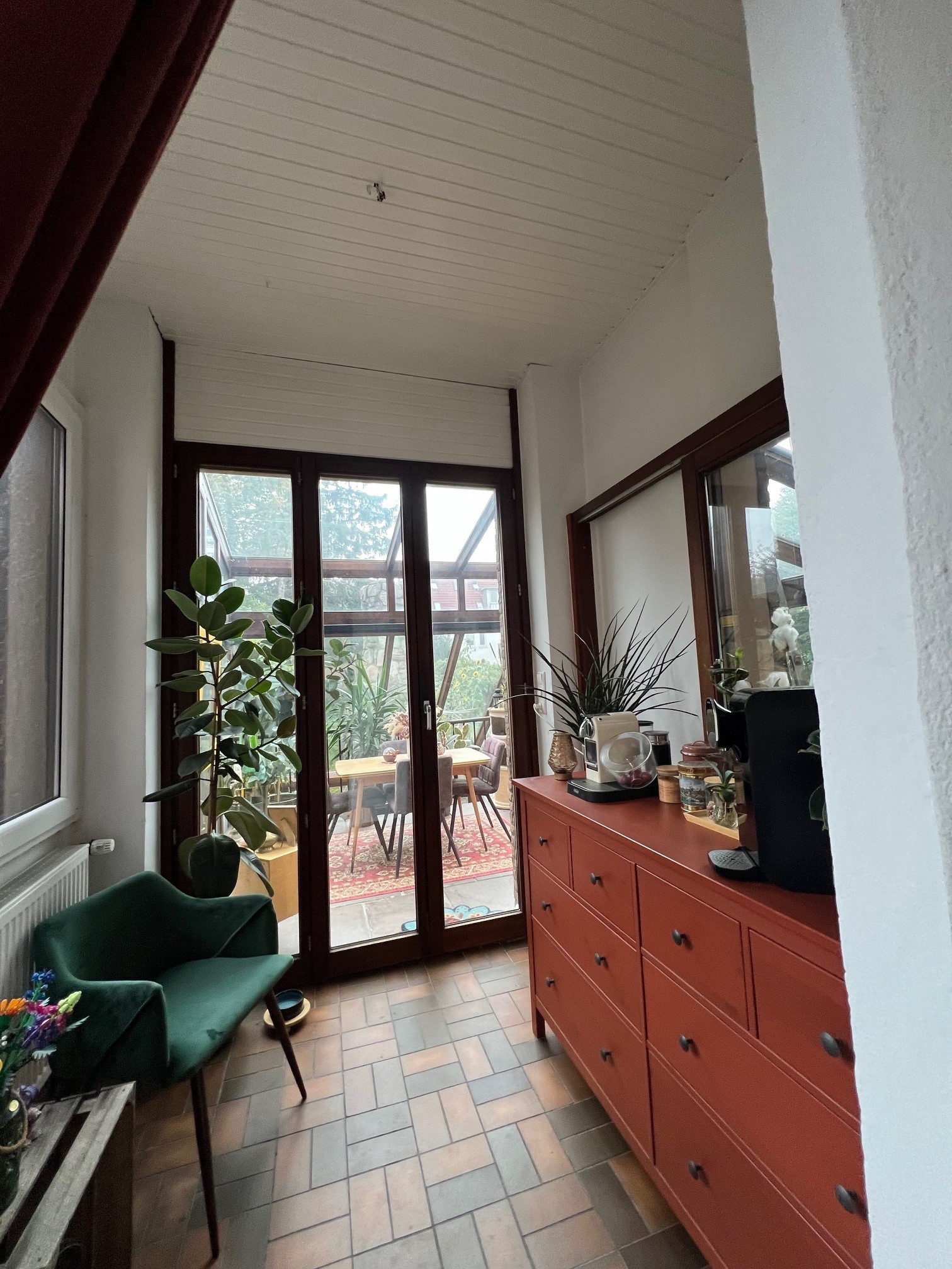 Vom unteren Teil des Wintergartens gelangen Sie durch eine Schiebetür in den Garten. Der Wintergarten